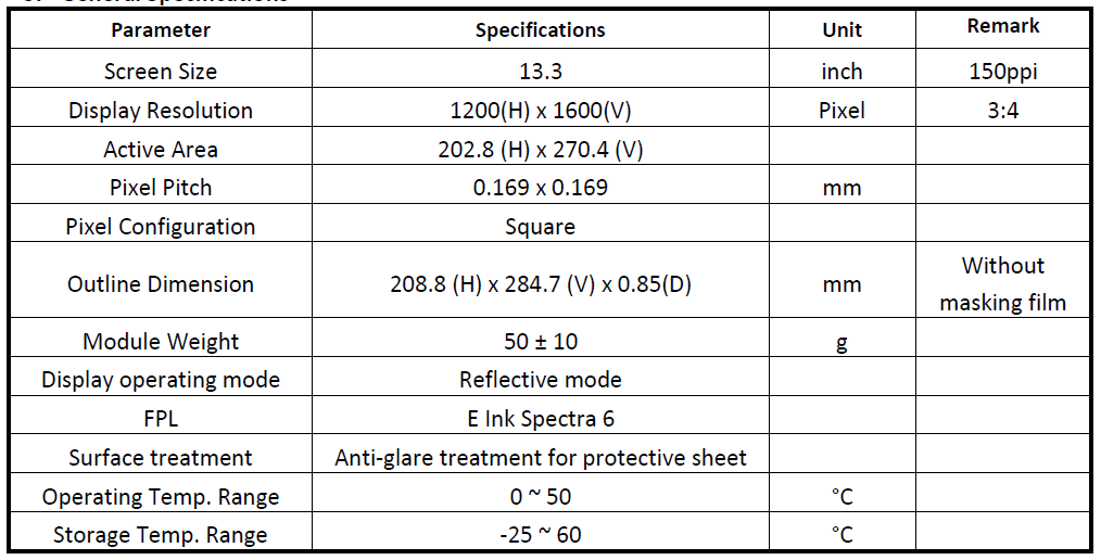 13.3” E6 - QSPI - 1600*1200 – 150PPI墨水屏