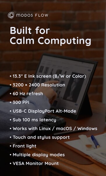 Modos already launched a mobile e-ink display on the market last year, but Modos Flow offers far better features. First and foremost, the new mobile e-ink monitor with a diagonal of 13.3 inches achieves a significantly higher resolution of 3,200 x 2,400 pixels with a pixel density of 300 PPI.