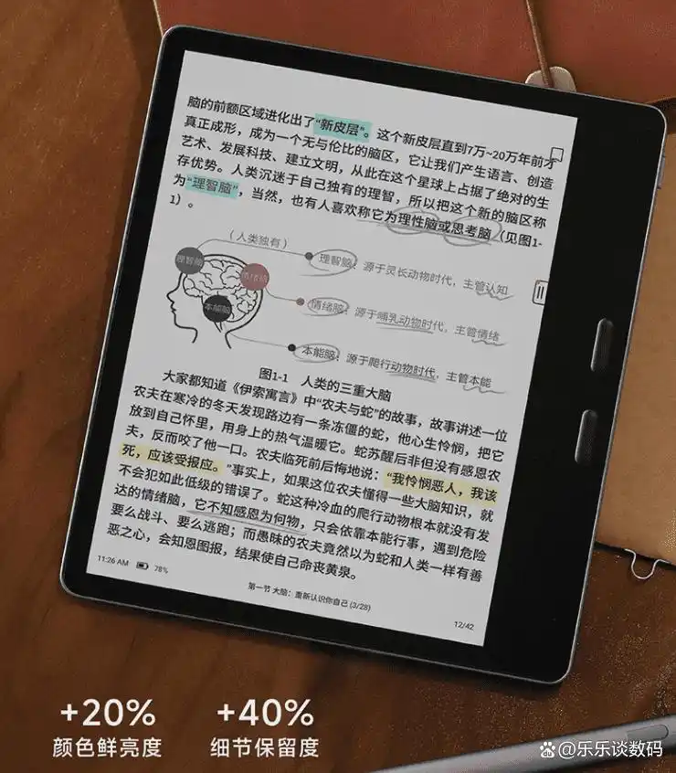 科大讯飞起点阅读器配备了一块彩色墨水屏技术,能显示多达4096种颜色,分辨率达到300PPI,漫画、插画和彩色图片的细节都能表现得很细腻。这块屏幕不仅护眼,还模仿纸质效果,看久了也不会太疲劳。翻页时,得益于自研的快刷算法,操作流畅自然,几乎没有残影,让阅读体验变得挺顺畅。