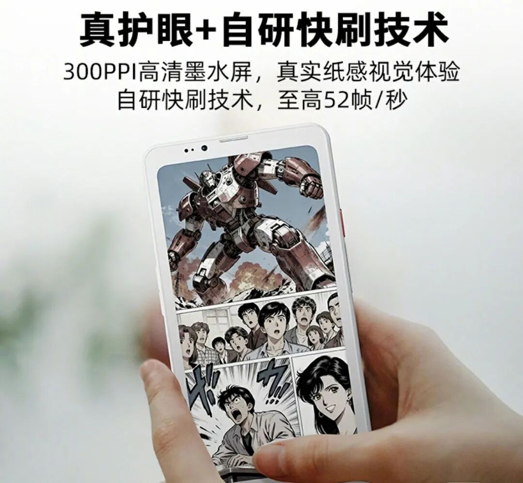 手机配备一块6.13英寸墨水屏,分辨率达到300 PPI。通过快刷技术,屏幕最高刷新率可达52帧/秒,并搭载自动清残影技术,能提升一点视觉流畅度。屏幕支持手写笔功能(需单独购买)。