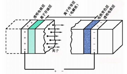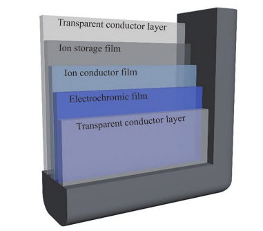 电致变色的变色原理主要有两种:(1)基于有机分子的氧化还原机理:在外电压的作用下,有机高分子或者小分子电致变色材料发生氧化还原反应,使其分子的能带发生变化,从而引起材料的颜色变化。(2)基于无机材料的晶格改变机理:外电压作用下,电解质离子嵌入到电致变色层引起晶格结构发生变化,从而使材料的颜色发生变化。电致变色器件的结构主要包括基底层、集流体层、电致变色层、电解质层以及离子存储层。