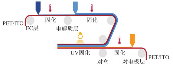 有机EC采用卷对卷涂布柔性工艺,以PET-ITO薄膜为基底,经等离子清洗后,通过狭缝涂布依次涂布电致变色层、全固态凝胶电解质及离子存储层。涂布后经分段烘箱干燥与紫外固化交联,最后与钢化玻璃通过PVB胶膜热压复合。有机EC材料可兼容刚性和柔性基底,且响应速度比无机EC快,可应用于消费电子及使用曲面玻璃的交通领域。