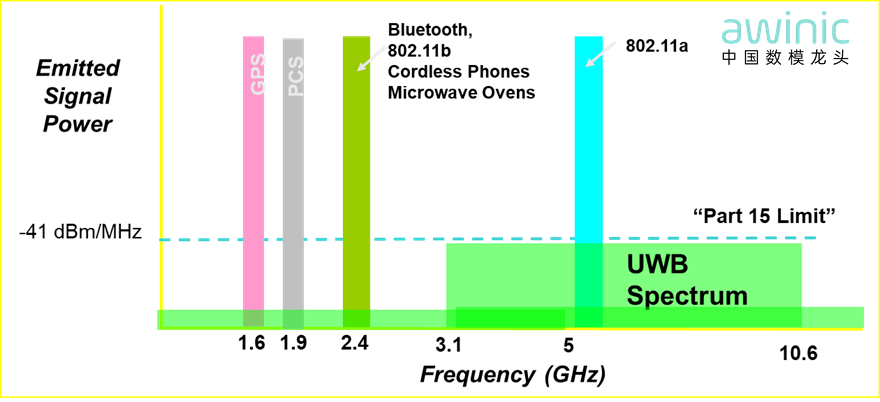 特点:使用极宽的频谱,故名“超宽带”,和极低的功率谱密度传输信号。信号穿透能力较差,有效距离很短(50米内)。