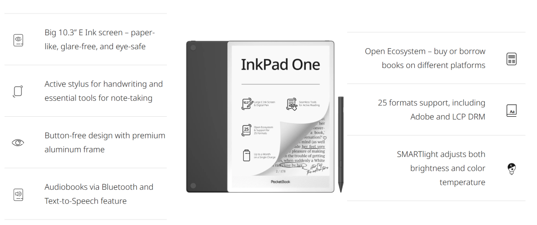 PocketBook近期推出了10.3寸的InkPad One,虽然搭载了四核处理器和2+32G存储,但226PPI的像素密度在2026年确实显得诚意不足。