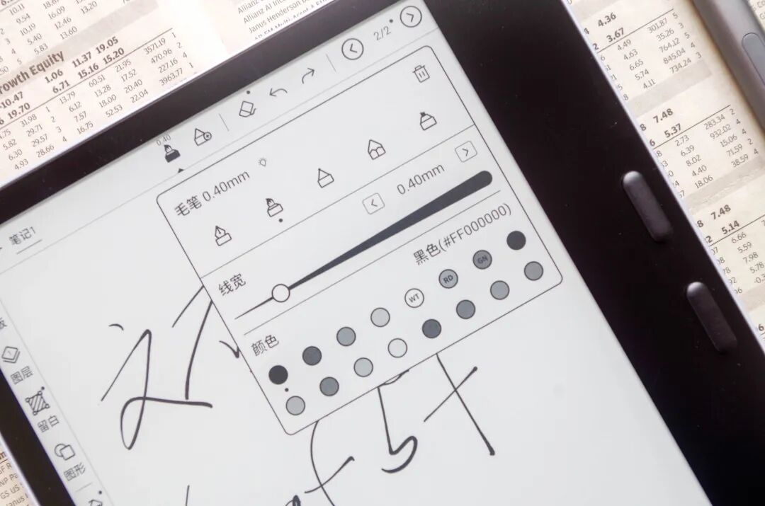在功能上和文石家其他读写本办公本都是一致的,能够在阅读页面提笔就写,提供多种笔刷,满足手帐爱好者的需求。