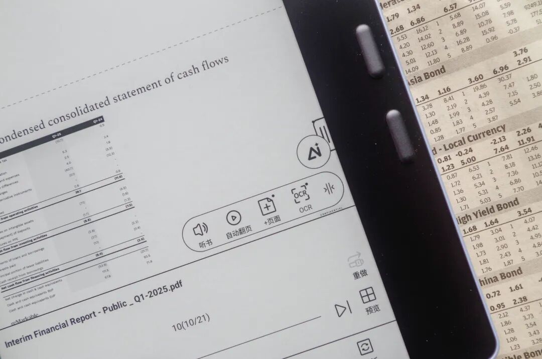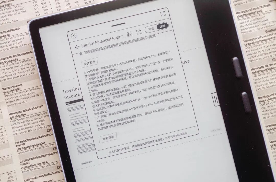 用户可以针对文本内容咨询AI,给出相应的结果,大象就展示一下给AI一个财报进行分析。全文是英文,文石Leaf5+可以整理出一个中文版本的解析,可以说以后语言都不是拦路虎了。
