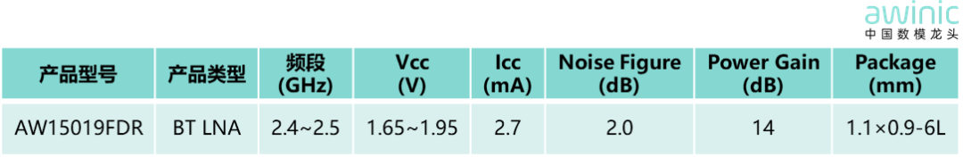 表3 艾为Bluetooth LNA AW15019FDR产品特性