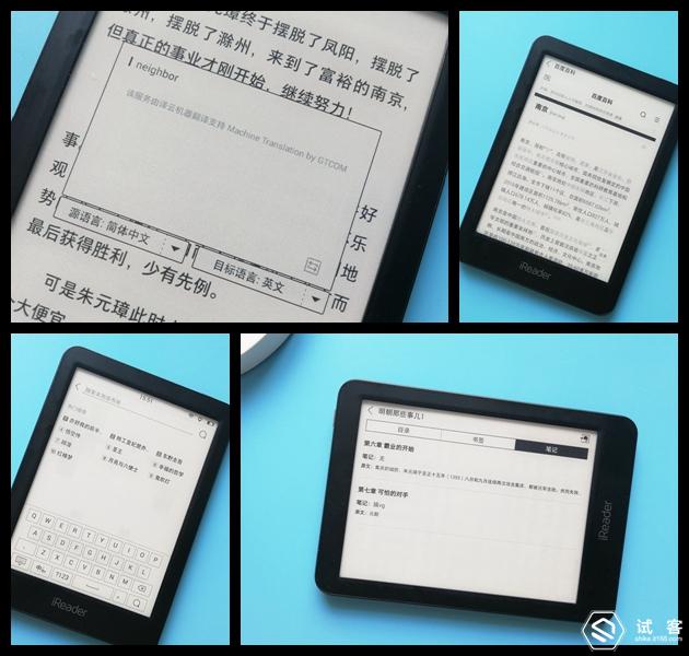 几个常规操作,除了调节行间距、字体大小。字体也有丰富的选择。同时支持横版和竖版切换,大段文章的标记,操作也很简单,整段的长按就是。但聚焦一个字或者一个词的长按,会呼出选项,可供选择的有翻译,百度百科搜索,文字内的标记,翻译的本地的,百度需要网络,而且速度与手机上没有差别。文字上标记相当于将自主编辑的内容贴在文字上,而且标记的内容在整本书都有顺序排版方便查找,还可以直接推送到自己的印象笔记账号上。图书支持本地搜索,以上种种,都是非常方便和人性化的设计,除了打字的时候,电子墨水屏的特性需要闪屏,有一点缓慢,其他的体验都是很优秀的,没有在纸质书上写字的快感,都比写字要方便。
