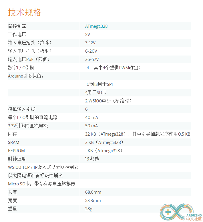 Arduino Ethernet是基于ATmega328的开发板。它有14个数字输入/输出引脚,6个模拟输入,16 MHz晶振,RJ45连接,电源插孔,ICSP接头和复位按钮。