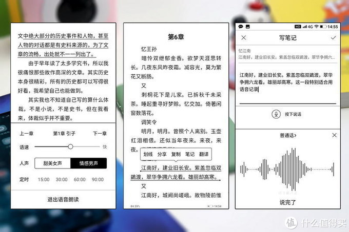 支持自动断章,可以边读书边做笔记,选段落做翻译,精彩文字分享功能齐全,再加上随意调整文字字体、76级字号调整,AI智能语音输入等等。值得一提的是AI听书功能,TSS引擎支持,发音精准清晰。既可以用喇叭外放,也可以接有线耳机或蓝牙耳机,挑个自己喜欢的音效和语速,用QQ/微信阅读闭目聆听,像我老爸那样的传统书虫也能享受科技的便利。
