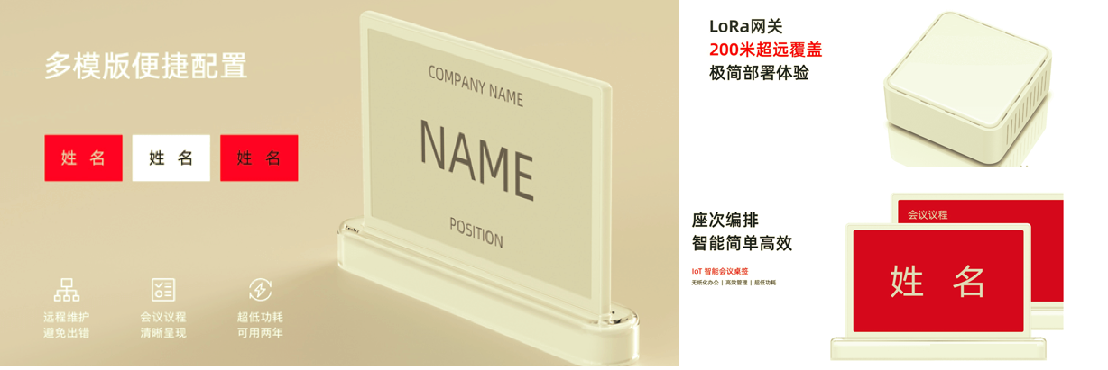 对于大型会议,几百个会议桌牌的场景;对于一个大型公司,拥有多个会议室希望统一管理;对于一个园区,希望在需要使用纸质标牌的地方都用电子纸来替代。。。上海零零智能推出了基于LoRa的系列电子墨水显示设备。