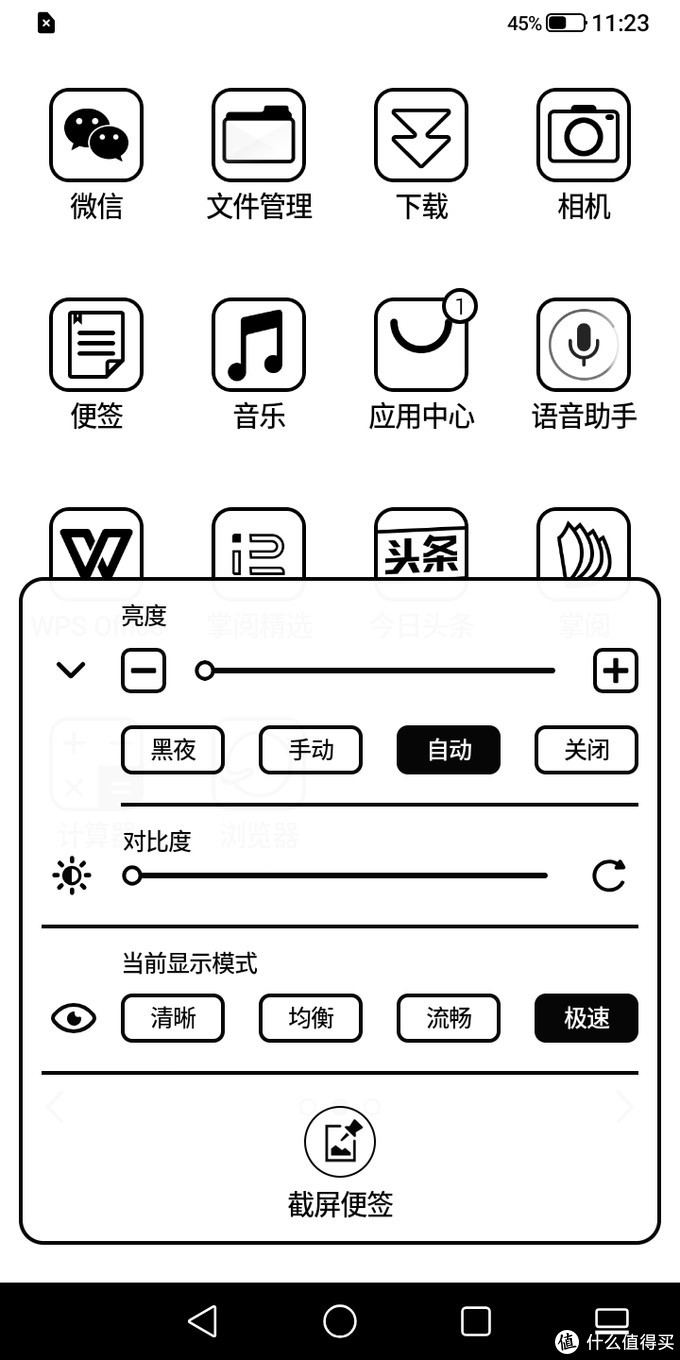 1、升级系统后,有清晰、均衡、流畅、极速四种模式,阅读用清晰或者均衡,平常使用用流畅或者极速,不然各种拖影会让人疯掉。