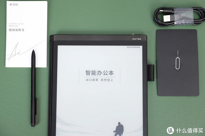 包装内除了讯飞智能办公本X2主机一台,还配有一支讯飞专门定制的4096级压感无源电磁手写笔,此外还有一根Type-C数据线,卡针,说明书等附件。需要说明的是,智能办公本X2还标配了皮质封盖和笔套,不用的时候合起来,既能自动关闭屏幕节省电量,还能起到保护屏幕的作用,而且手写笔也能随身携带。