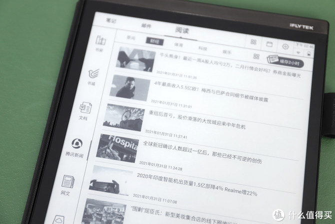 值得一提的是,讯飞智能办公本X2还支持绑定百度网盘,关联后可下载网盘阅读资源至本地。此外,还自带腾讯新闻,通过网络获取即时新闻资讯,随时掌握更多信息。