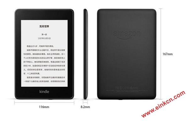 而屏幕大小与Kindle Paperwhite 3一致,还是6英寸,不过整体的机身却比前任更为轻薄,三围分别是:167毫米*116毫米*8.2毫米,长宽高相比Kindle Paperwhite 3都有减小,整体重量减轻了大概10%,只有182g,尤其是机身厚度从9.1降到了8.2,可以说是历代Kindle Paperwhite 中最轻薄的一款了,重量可能还不到很多纸质书的一半,在长时间阅读上应该会有更舒适的阅读体验,同时也将更方便携带。