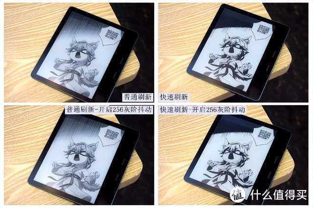 而从实际体验来看,普通刷新和快速刷新模式下都能够开启256度灰阶抖动,最明显的变化是灰阶过渡更柔和了,原本生硬的线条感与灰白过渡表现得更自然,大幅度提升了用户阅读漫画和图片时的体验效果。