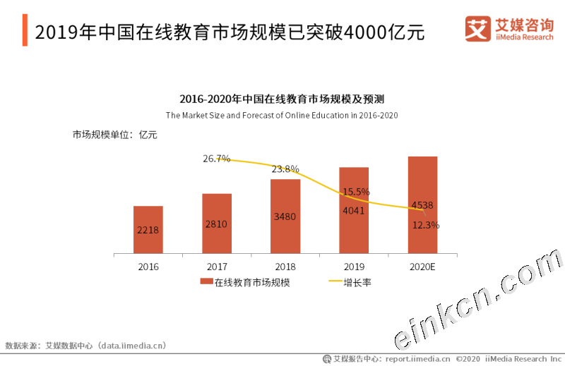 随着互联网的普及与发展,在线教育已成为教育和互联网领域的热门产业。iiMedia Research(艾媒咨询)数据显示,中国在线教育市场规模逐年上升,预计2020年达到4538亿元。艾媒咨询分析师认为,由于疫情期间在线教育用户量的大幅增加,在线教育市场规模将继续维持快速增长趋势。其中,升学压力影响下的中小学在线教育中是重点细分领域。