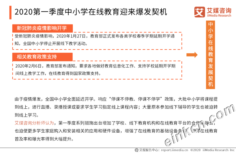艾媒咨询分析师认为,虽然“新冠疫情”的爆发对中国经济造成冲击,但中小学在线教育却反迎加快发展的契机。在院校“停学不停课”的要求下,中小学在线教育需求在第一季度急速爆发,行业原本发展面临的家长观念接受及学生教育管理问题,在各地统一组织下都暂时得到解决,良好的在线教育产品体验有望进一步消除家长及学生顾虑。另一方面,在线教育的推行,使更多家庭需要配备基础支持设备,也有利于疫情过后用户继续使用中小学在线教育产品。