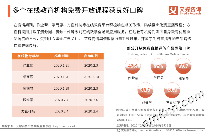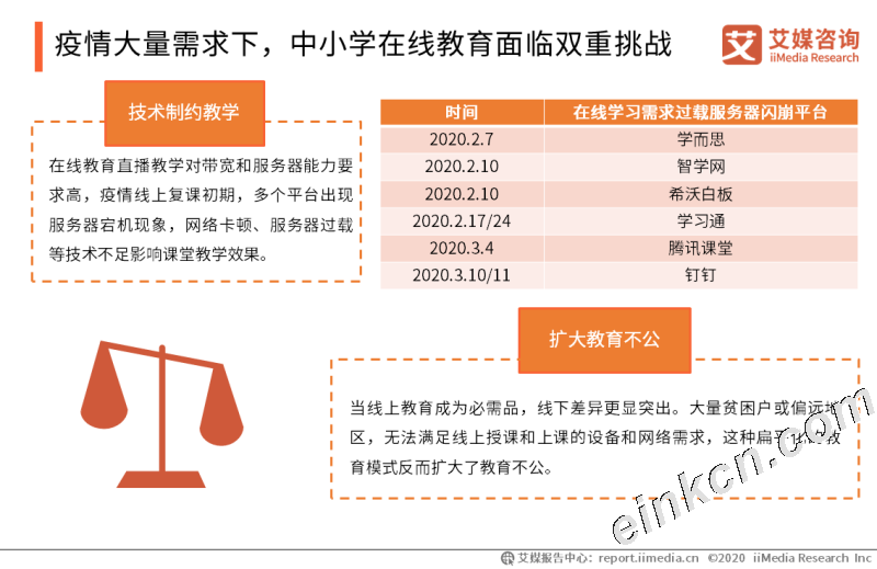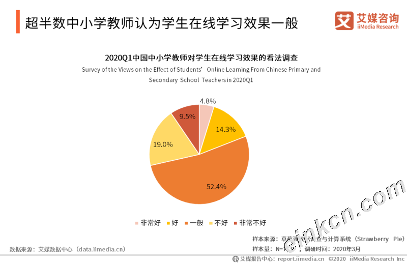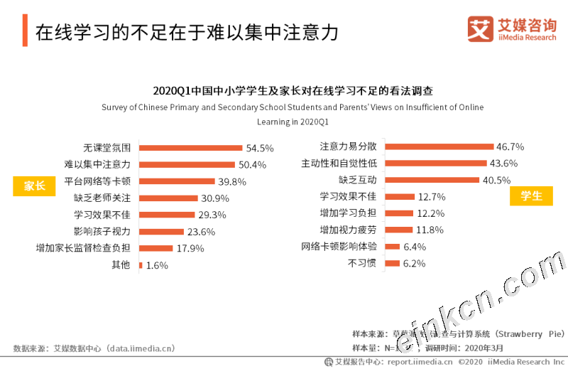 iiMedia Research(艾媒咨询)数据显示,多数学生及家长认为在线学习难以集中注意力,缺乏互动没有课堂氛围。艾媒咨询分析师认为,在线直播课目前仍存在产品互动设计不足,难以吸引学生注意力等问题,其次,直播卡顿也意味着平台服务器还需技术升级以容纳更多需求。