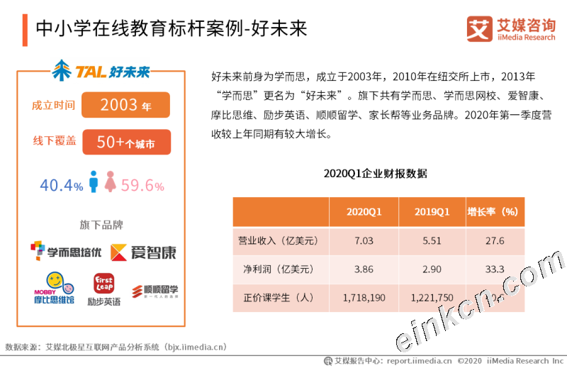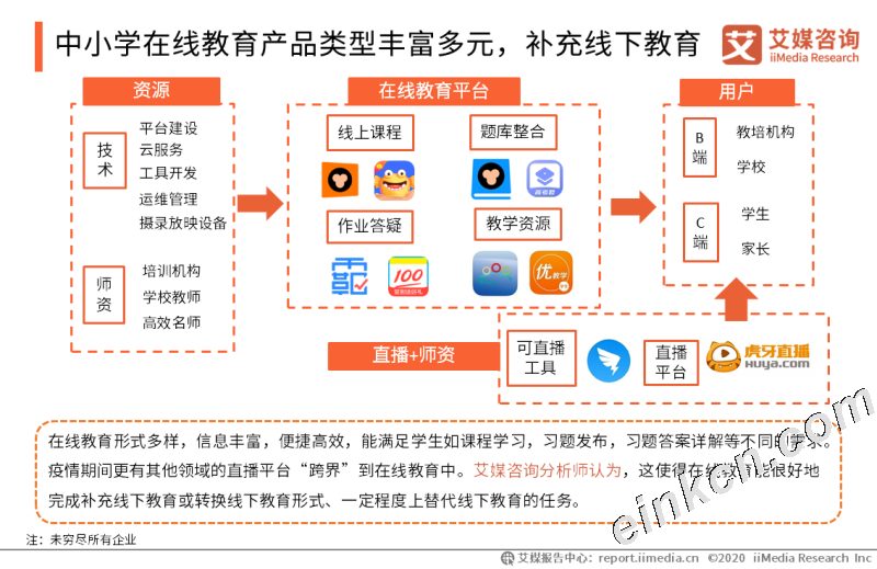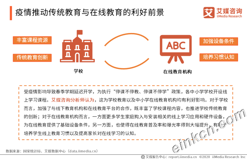 艾媒咨询分析师认为, “新冠疫情”的影响下,学生课内学业作业在线化辅导进一步得到推广;对于教师而言,疫情期间也逐渐适应线上教学模式,传统中小学教育结合线上发展的趋势得到增强。另一方面,中小学学校对于学生课外网课学习的接受程度逐渐提高,未来在线教育在补充学生课内教学和课外辅导方面的应用有望进一步加强。