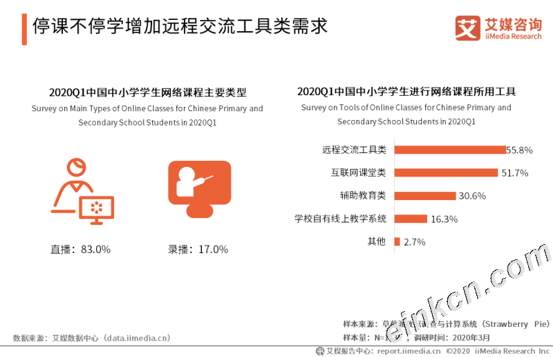 iiMedia Research(艾媒咨询)数据显示,超半数受访中小学学生使用远程交流工具类以及互联网课堂类产品进行网课,83.0%的中小学学生所上网课为直播课形式。艾媒咨询分析师认为,疫情期间停课不停学的政策下,许多学校直播课程的开设,对直播工具的需求增大,为非在线教育行业的工具进入在线教育行业提供了契机。