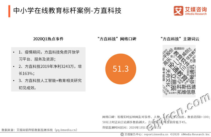 艾媒商情舆情数据监测系统显示,系统监测期间,方直科技网络评价良好,主要基于三方面,一是疫情期间方直科技履行社会责任,免费开放学习资源;二是方直科技2月公开2019年年度报告,营收形势利好;三是方直科技在AI赋能教育技术方面取得成效,未来发展具有潜力。