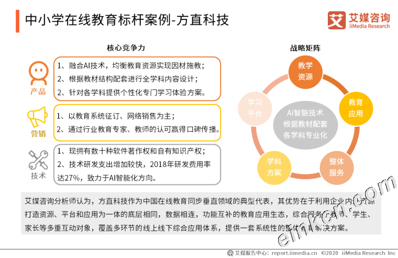 艾媒咨询分析师认为,目前各类中小学在线教育产品个性化特征不明显,产品同质化问题突出。在巨大的学生体量规模基础,以及家长对学生教育重视程度持续高企的情况下,中小学在线教育市场巨大,在各个细分领域都有发展空间。未来各在线教育平台需要继续深化在细分领域的发展,包括产品内容设置、针对辅导学生、课程类型设置等方面均可细化发展。